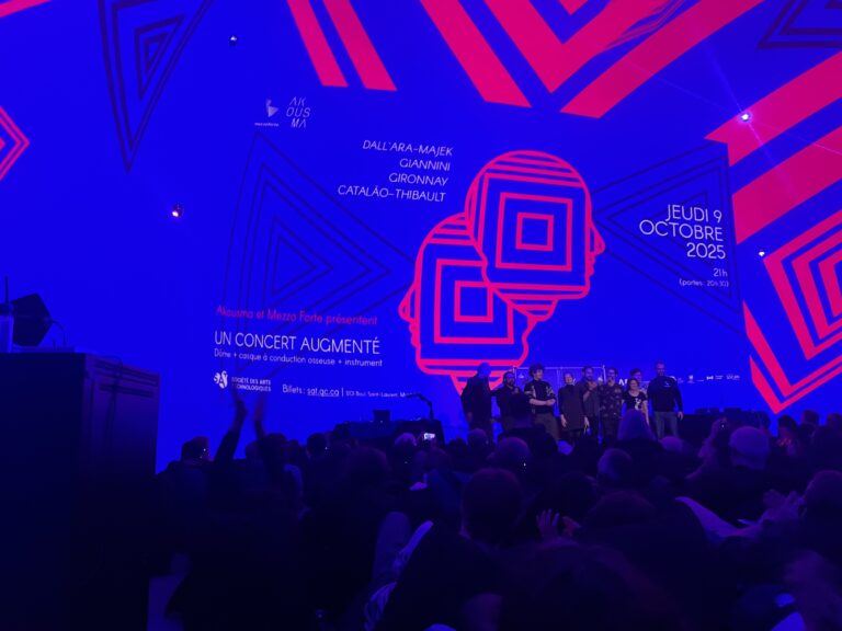 On October 9, a packed house was held under the dome of the Society for Arts and Technology for the Augmented Concert presented by Akousma. This pioneering event, which for the first time used bone conduction headphones in a structured manner in an electroacoustic concert context, featured four specially commissioned mixed music works.