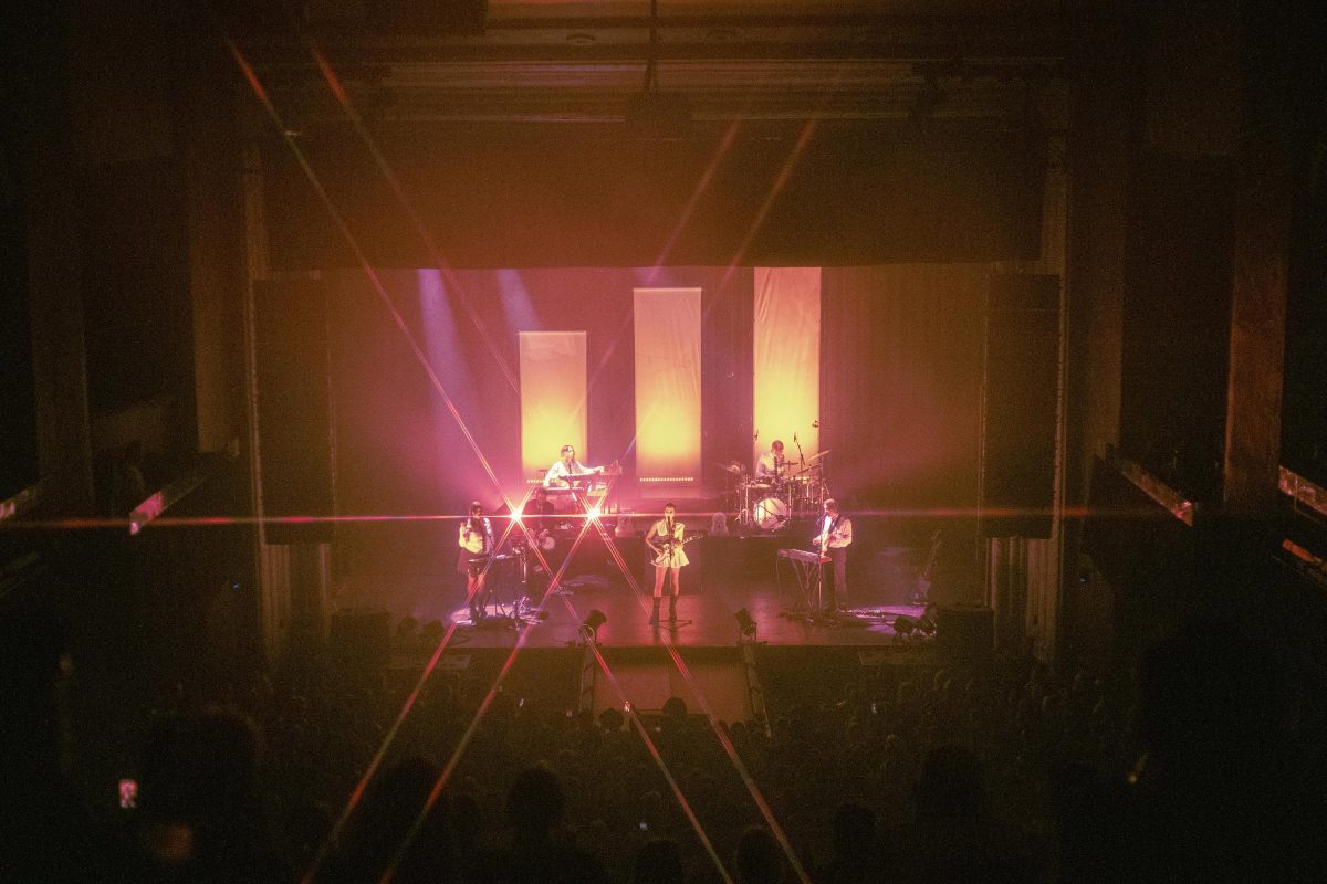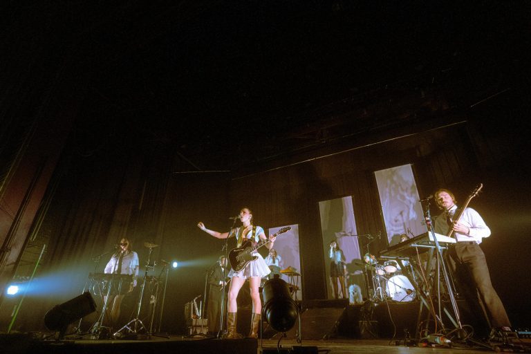 Silence, lights, action, Ariane Roy comes up on stage dressed in a white robe topped with a plaid red velvet corset and a yellowish tie. Her eyes, contoured with glitter, shine as she sings the lyrics to the title track “Dogue.” The crowd is hectic, everyone is singing the chorus, and for a moment, we all harmonize together with Ariane Roy. Odile Marmet-Rochefort is playing the keys while harmonizing on the backing vocals with three back vocalists who act as support during the performance alongside Dogue’s producer, Dominique Plante, who plays saxophone, flute, bassist and guitar, who also comes and brings support on backing vocals.
