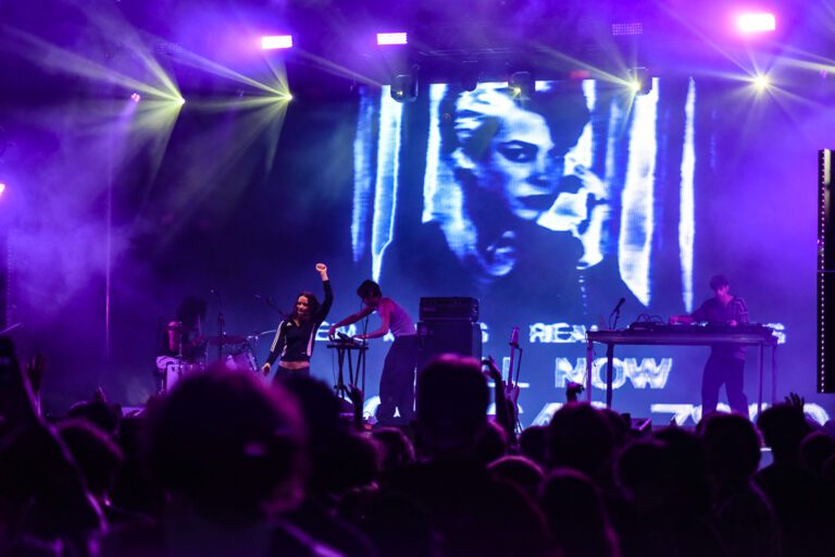 Such is the case for NYC electronic band Fcukers, who, despite having meteoric success that can only be the result of intense musical nepotism, also deserve every packed dancefloor they play. The band, fronted by vocalist Shannon Wise and now playing as a four-piece with live drums, bass, and scratch-record backing, opened their Palomosa set with the modern classic “Homie Don’t Shake,” which elicited a raucous cheer from the steadily growing sunset crowd.