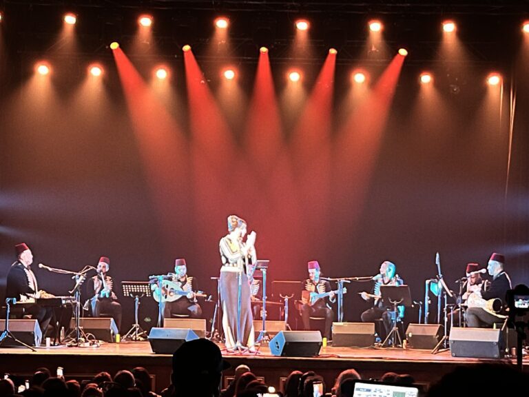 She performs the famous song “Historia de amor,” singing it in Spanish and Arabic with great precision. Some songs begin calmly, gradually accelerating as the crowd applauds and cheers, culminating in an explosive finale. Among the well-received covers was Rachid Taha’s famous song, “Ya Rayah,” with Lamia letting the audience sing along. The number of dancers increases, leaving their seats to move to the sides of the stage to create more space for dancing.