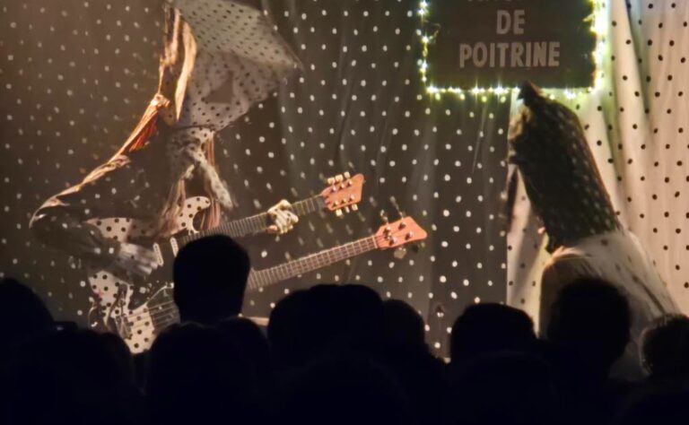 The Angine de Poitrine tandem may not be on the verge of a stroke, but the signs of the electrocardiogram (cardiogam!) don’t lie: the buzz is tangible, we were able to measure its impact at Ausgang, on Friday, November 21, in the context of M for Montreal. This microtonal guitar-percussion tandem (Khn de Poitrine and Klek de Poitrine on the drums) coated with electro is booming on the indie scenes with its carnival costumes and its digitized Cro-Magnon tracks, served in the form of friendly saturated grunts. Good beasts! All these elements contribute to a winning formula, both daring and hilarious. Tribal grooves are thus immersed in a thick magma of effects pedals and other hypnotic frequency generators. All the beats on the program are well-known, often inspired by prog and mathcore (for the composed bars), psych-rock, Ledzeppian hard-rock (for Jimmy Page’s famous oriental riffs, necessarily microtonal) or downright noise. The interventions of the microtonal strings (Siamese guitar and bass, two handles and a single body) thus eject us from the melodic scales commonly used in the mentioned styles.