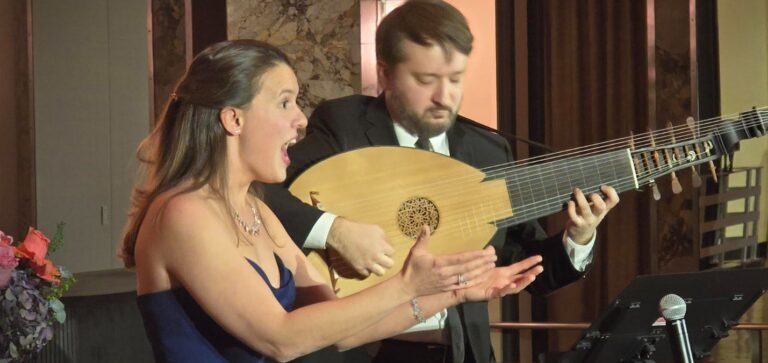 Lute accompaniment is rare in today’s music scene, yet Kerry Bursey has chosen to cultivate this fertile ground. The lute truly transports the listener back to ancient times and the musical atmospheres of the past. This choice led the artists to perform works by English lutenist, singer, and songwriter John Dowland (1563–1626), the most famous composer of the Elizabethan era, whom Bursey humorously calls the ultimate “emo” composer—he passed away exactly 400 years ago. Bursey, as lutenist and tenor, first performed Now, O Now, I Needs Must Part, harmonized by Janelle Lucyk’s singing, paired with an obscure Francophone song, Le doux silence des bois (Honoré d’Ambruys, 1660–1702).