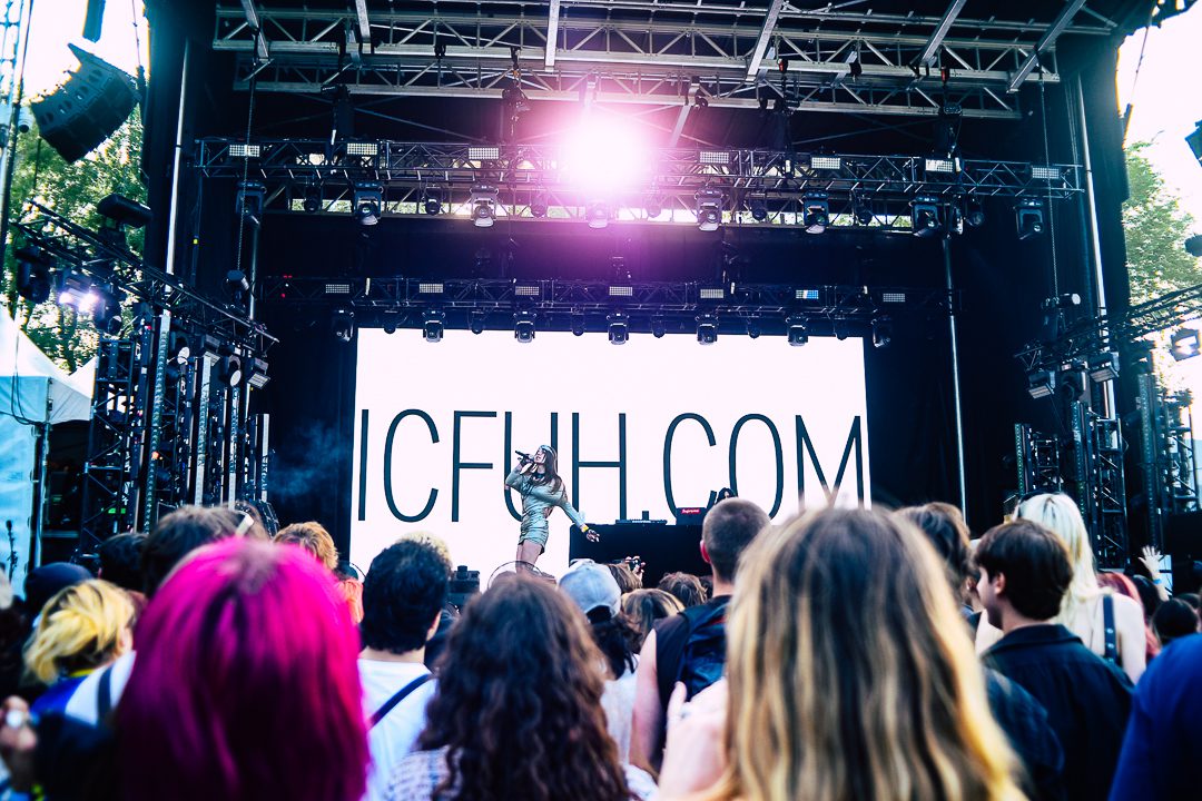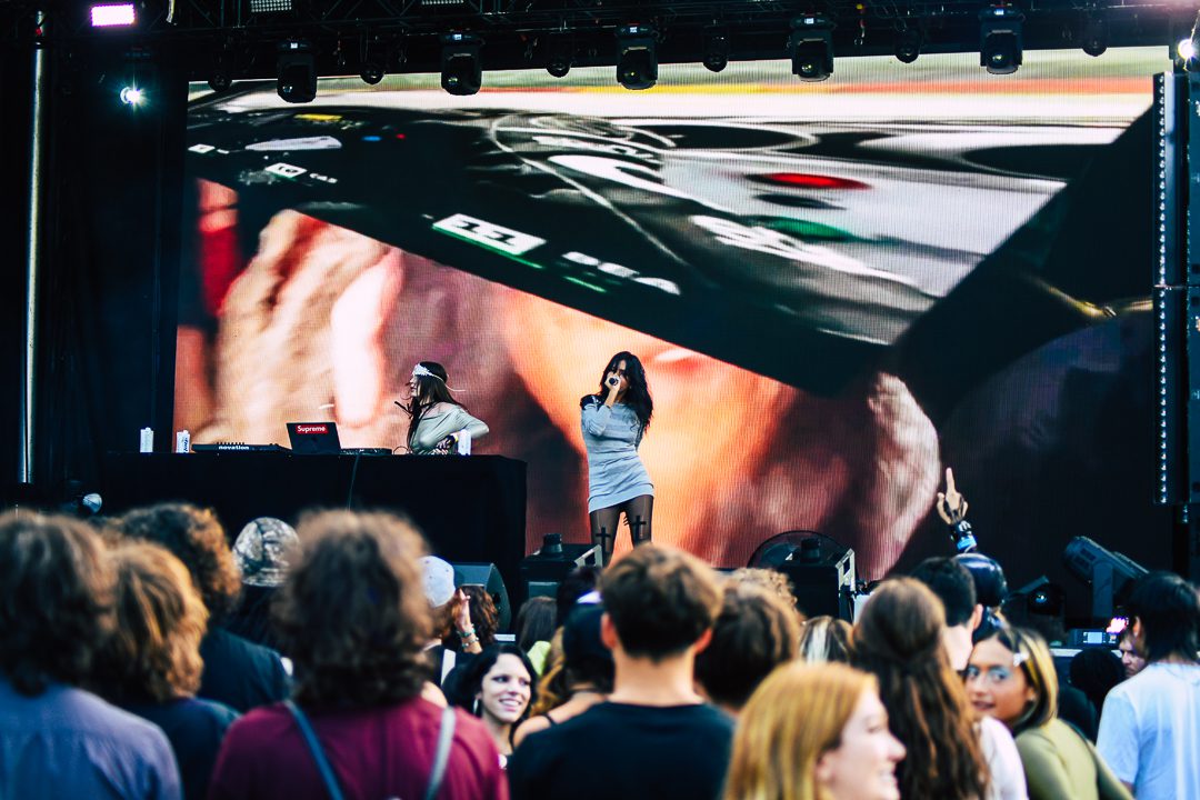 We were transported to the wacky years of the 2010s as MGNA Crrrta, a trashy electro girl dance pop duo from New York, took the stage to open the main Fizz Stage at Palomosa. The sound person was having a bit of trouble with the mix as the vocals were extremely quiet, competing with a wall of inexplicable bass. This went on for half of the set. But both singers/ DJs, Farheen Khan and Ginger Scott, didn’t seem phased as they blasted on through as song like “I.C.F.U.H,” an acronym that appeared multiple times on the visual backdrop. Listening to the lyrics, you deciper that it stands for “I Can Fuck You Hard,” which also happens to be the name of the duos website.