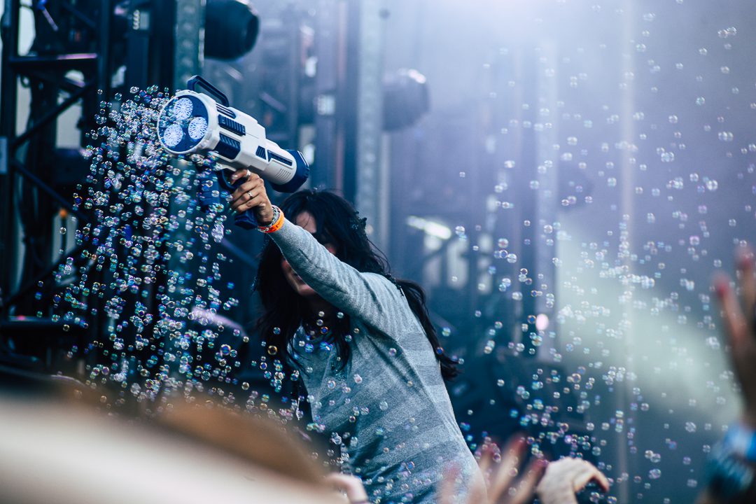 This trashy and sleazy energy permeated through MGNA Crrrta’s set and the visuals, sporadic epilepsy-inducing flashes of gaudy mansions or the duo smoking weed on bridges, matched the tone. For my personal taste, many of the songs were pretty one-note, but they had a lot of energy and, for the last few songs, bubble guns. They were a fine opener to Palomoa’s main stage shenanigans.