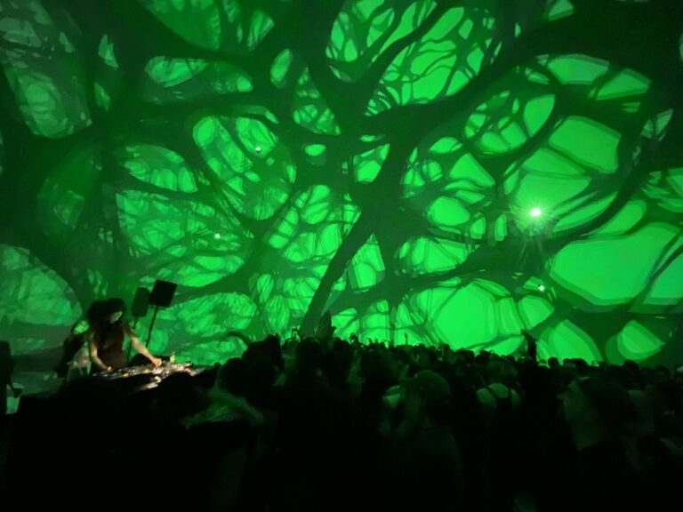 The room is almost empty when I arrive. The projections move slowly and catch the eye, sparse but impressive. The first DJ, Asha from the Ether collective, sets the mood for the evening. I sit down near the bar, enjoying the calm before the storm. Soon, the room is packed.