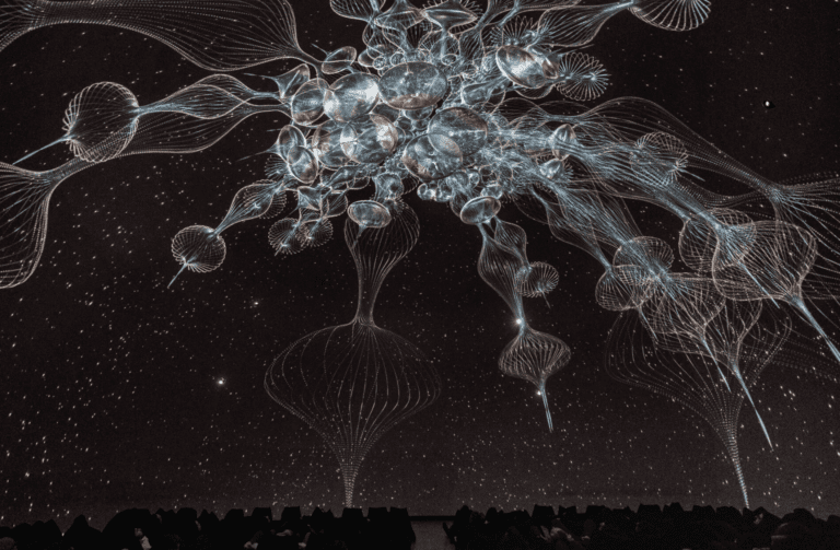From my earlier conversation with Kenway, I held questions in mind on how abstract representations of “sleep architecture”, and statistical models would translate in the dome. While it was not to the degree of precision of a Xenakis score, the music allowed more aesthetic freedom which probably saved us from a 40 minute atonal descent into madness (see Persepolis). Still, conceptual music exists at a delicate intersection between emotionally accessible and intellectually stimulating content. Between Dreams leans towards the former. While some elements of pitch and temporality created important ties to the underlying references to science, there lacked detail in how this applied to texture and composition. At the same time, it could be a bias from trying to decipher Patrick Trudeau’s quantum-scale visual abstractions. So I ask myself, can sound represent this type of complexity?