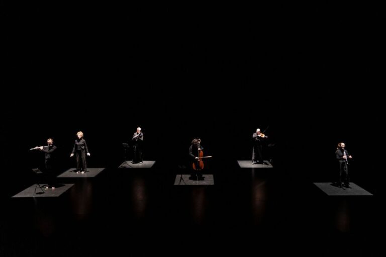 The concert begins with the usual acknowledgment of the unceded territories of Tiohtià:ke (Montréal), which Krystina Marcoux performs this time in sign language, while her voice-over resonates from speakers positioned behind her. Perhaps without realizing it, the audience has already entered the work. Speak no words – Le silence des mots is intended as an exploration of gesture turned into language, and its evocation is communicated from the very beginning.