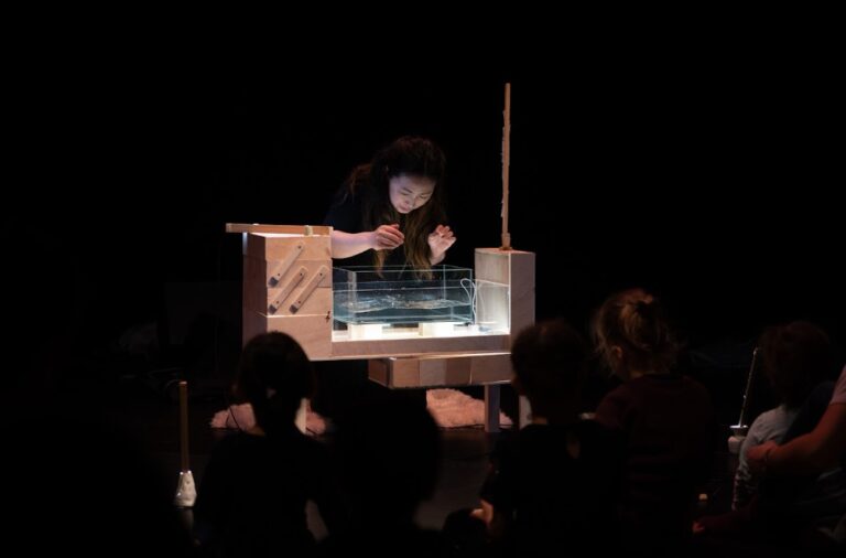 The show notes tell us, in fact, that we were to expect music, scenography, and lighting that was “adapted to the psychology and understanding of the world of children under 3 years old. At the heart of the show: a luminous box full of surprises, made of various compartments and drawers.” It seemed that some children missed the memo, however.