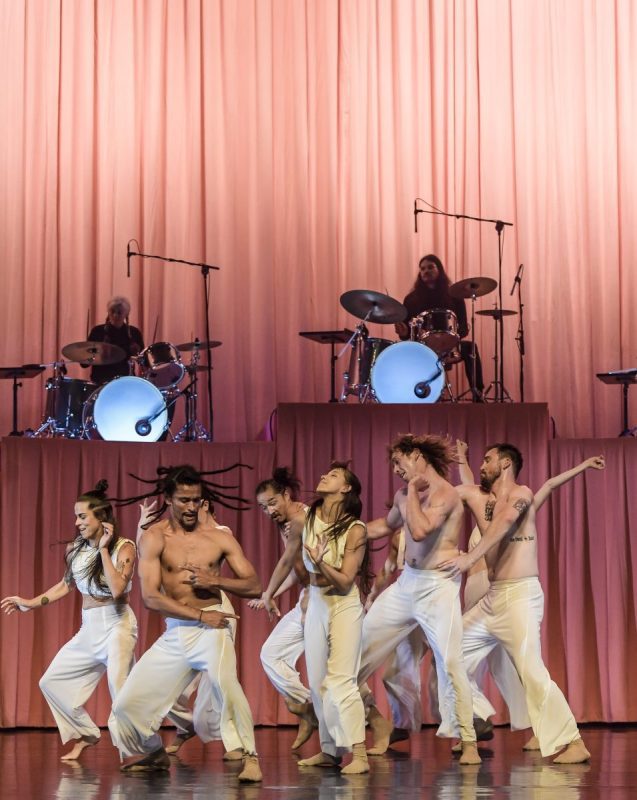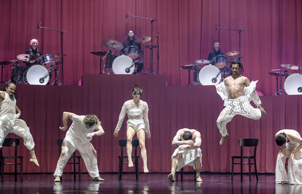 And on that, the dancers react like a symbiotic organism, like a plethora of ultra-flexible and agile muscles, directly connected to the musical and expressive nerve, transmitted instantly through the sound impulse of the nine musicians. The coherence of the ensemble, the perfect coordination among all these people is remarkable. The effect is memorable. We are captivated, excited, and an hour passes like ten minutes.