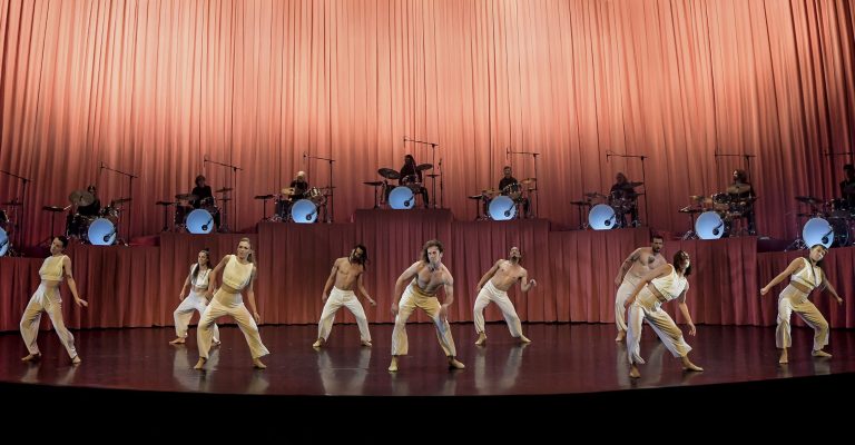 The brilliant intuition of choreographer Stephanie Lake is that she did not limit the gestural action to a mere mimicry of the sonic action. Yes, the dancers closely follow the rhythms and sound dynamics of the nine drums, but it is in the “undulating” quality of the gestures, both individual and collective, that one perceives a construction in complementarity of the two expressive entities, music and dance. The percussive nature of the music is therefore compensated by the incessant fluidity of the movements. Each gesture of each dancer is connected to the next like in a natural organic sequence. Each movement metamorphoses into the next and so on. This is true both on an individual and collective level. The mechanical nature of the score, although sometimes fragmented, flourishes in a contrapuntal balance with the fluid, wave-like nature of the choreography. A very well-balanced architecture between what our ears hear and what our eyes see.
