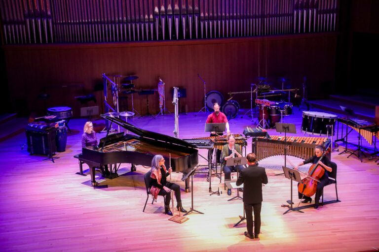 Saturday evening at the Claude-Champagne Hall of the University of Montreal, a concert was held to celebrate the anniversaries of two venerable Quebec musical institutions: the 60th of the Quebec Society of Contemporary Music (SMCQ) and the 75th of the Faculty of Music of the University of Montreal (UdeM). Contemporary Confluences, the title of the concert, highlighted the many intersections between the two organizations. The program honoured the various musical directors of the SMCQ throughout history (Serge Garant, Gilles Tremblay, Walter Boudreau, Ana Sokolovic), who have all also been teachers at UdeM. As a bonus, a creation by a young composer, Maxime Daigneault, because we must not forget that the mission of both institutions is also to ensure the future of contemporary classical music. It was the SMCQ ensemble, led by Christian Gort, and the UdeM Contemporary Music Ensemble, led by Jean-Michaël Lavoie, who shared the stage and the pieces, sometimes in tandem.