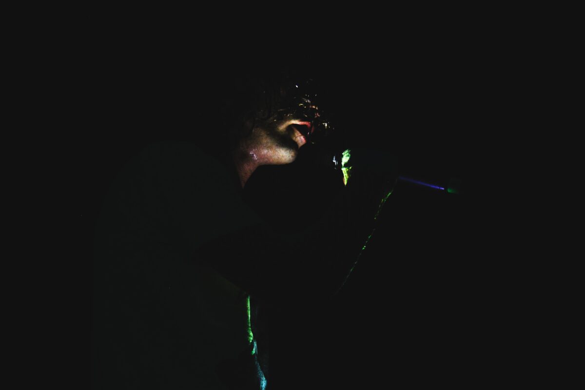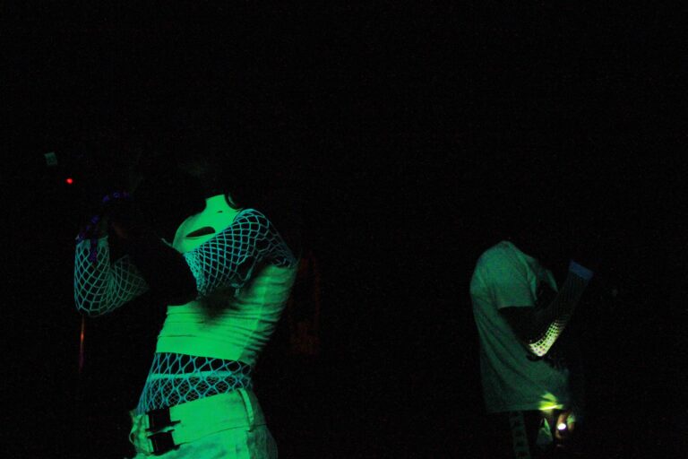 UTO émerge de l’obscurité du Cabaret de la Dernière Chance sous des lumières UV, tout de blanc vêtu, le visage obscurci par le contraste de la lueur. Le profil sonore expérimental implacable d’UTO les précède, mélangeant des synthés lourds, des percussions éclectiques et des voix déformées avec un rendu à la Björk. Leurs enregistrements sont une tapisserie d’exploration auriculaire. L’intrigue s’empare de la foule alors que nous observons ces corps mystérieux se frayant un chemin entre le public et la scène. Ils se lancent parfois dans une danse semi-chorégraphiée, se tenant debout et chantant à d’autres moments.