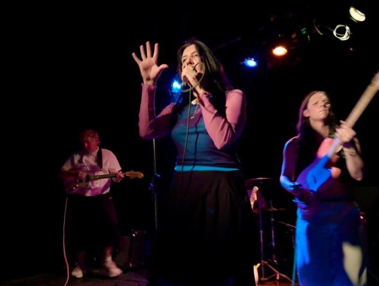 Son partenaire, le multi-instrumentiste Billy Riley, la bassiste ainsi que le batteur étaient tout autant survoltés, donnant lieu à une prestation très incarnée et flamboyante, tout en mouvement. La complicité entre les musiciens était palpable, chaque regard ou sourire semblant alimenter la tension électrique du moment. On pouvait observer une subtile identité queer au sein du band : bassiste au genre ambigu, Riley vêtu d’une chemise à froufrou et jouant de sa guitare rose scintillante, détails qui participaient à l’esthétique unique du groupe.
