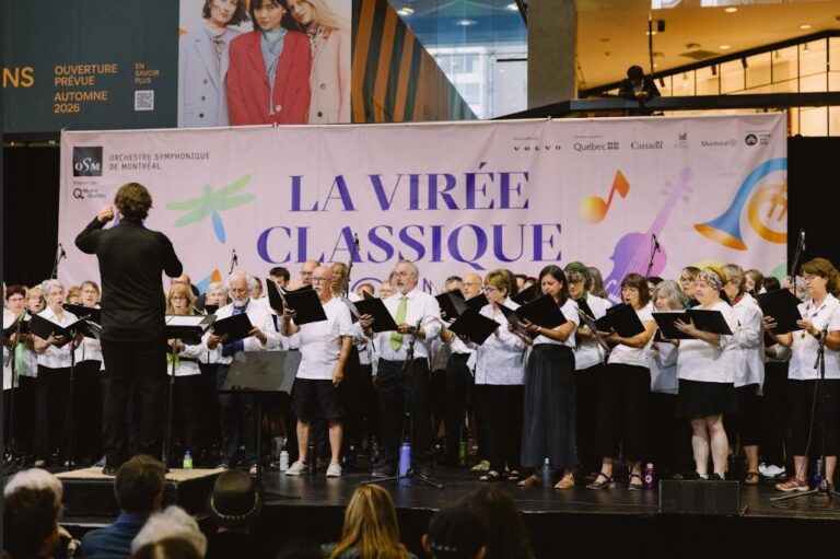 Pour terminer cette Virée classique 2025, l’OSM organisait un grand rassemblement choral pour deux prestations gratuites. Ce spectacle réunissant 135 choristes issus de 84 chorales était mené par les bons soins du chef réputé Simon Rivard.