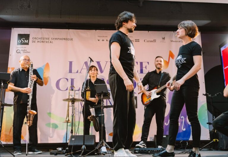 Fort heureusement, la pluie n’a eu aucun impact sur ce jeu d’improvisation prévu dimanche par la Virée, puisque l’exercice fut mené à l’Espace culturel Georges-Émile-Lapalme sur le coup de midi. Acteurs, actrices, musiciens et musicienne ont mis toutes leurs compétences au service de l’improvisation sur une série de thèmes dont l’objet est de captiver, faire rire ou même émouvoir. Martin Racine en fut l’arbitre et animateur de ce jeu d’improvisation opposant deux équipes d’acteurs (Emmanuelle Fadin, Julien Normand, Marie-Lune Falardeau-Drolet, William Bernaquez ) dont les impros théâtrales s’accompagnent cette fois de musiques imaginées en temps réel. André Moisan aux clarinettes, Hélène Lemay au trombone et percusssions, Jimmy Lahaie aux guitares et gugusses électroniques. En toute cohérence et en toute cohésion avec les thèmes imposés (les saisons, La belle au bois dormant, etc.) , ce power trio aura suggéré plusieurs impros inspirées souvent d’airs connus, du Vol du bourdon de Rimski-Korsakov à Moon Dance de Van Morrison en passant par Les feuilles mortes de Joseph Kosma, Le clavier bien tempéré de JS Bach et autres When the saints go marching in. Nous n’étions pas exactement dans le strict corpus classique de l’OSM, avez-vous saisi!